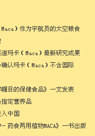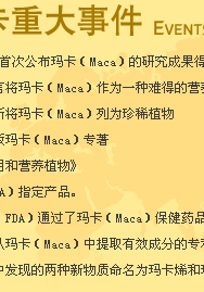 国际登山组织联盟、韩日世界杯足球赛也把玛卡指定为营养品,美国太空总署(NASA)把玛卡作为宇航员专用食品。玛卡的高度营养价值非同一般,销量连续十年位居世界前列。